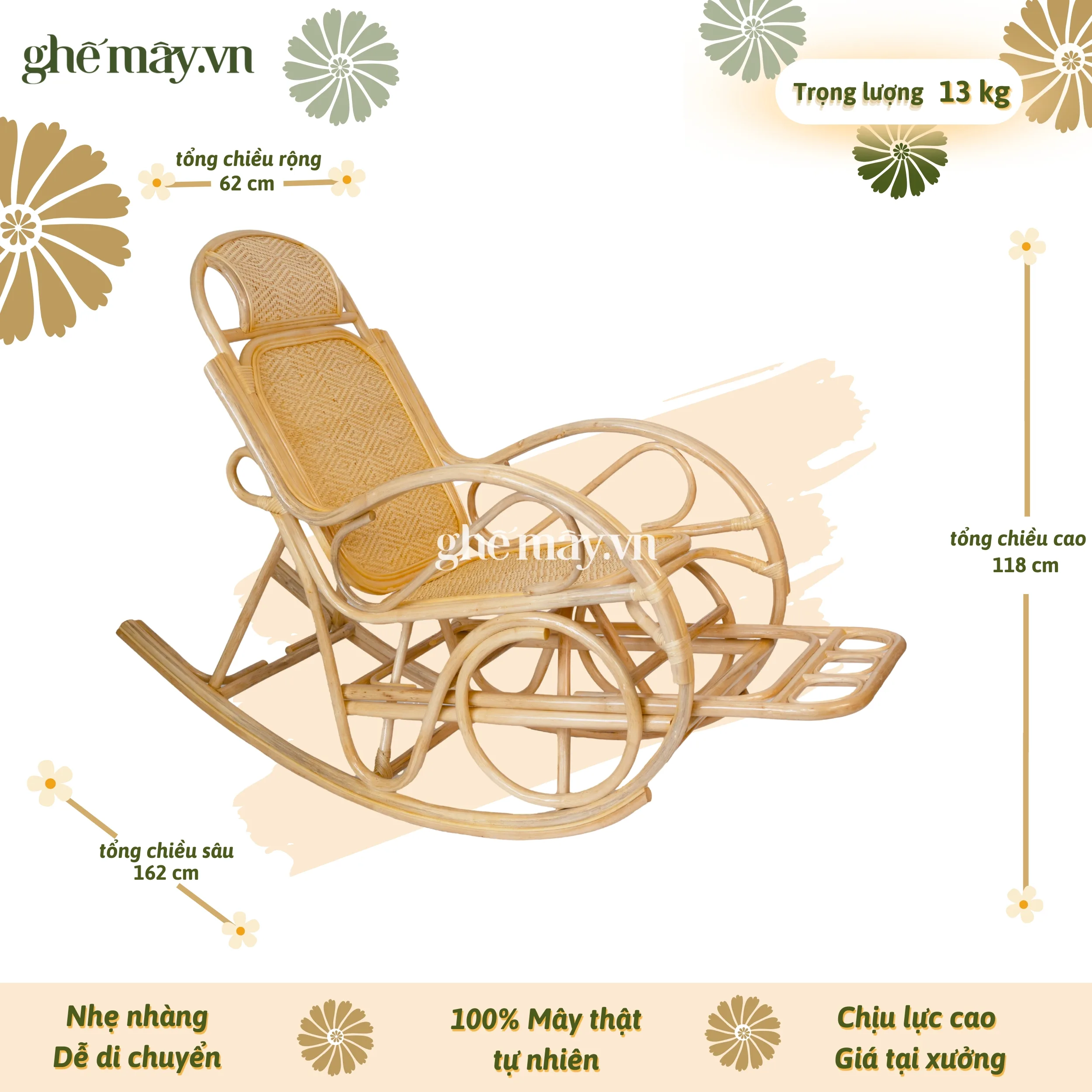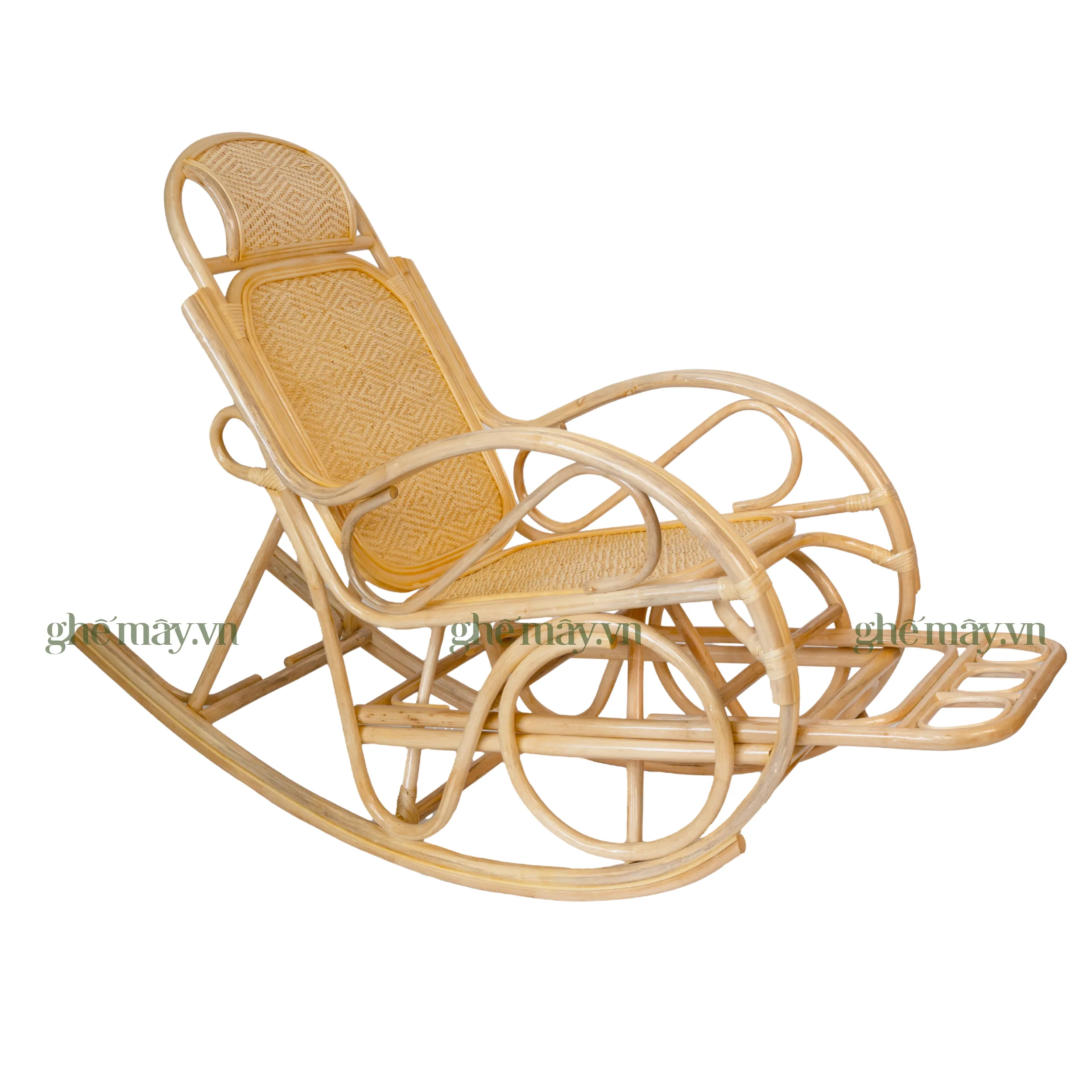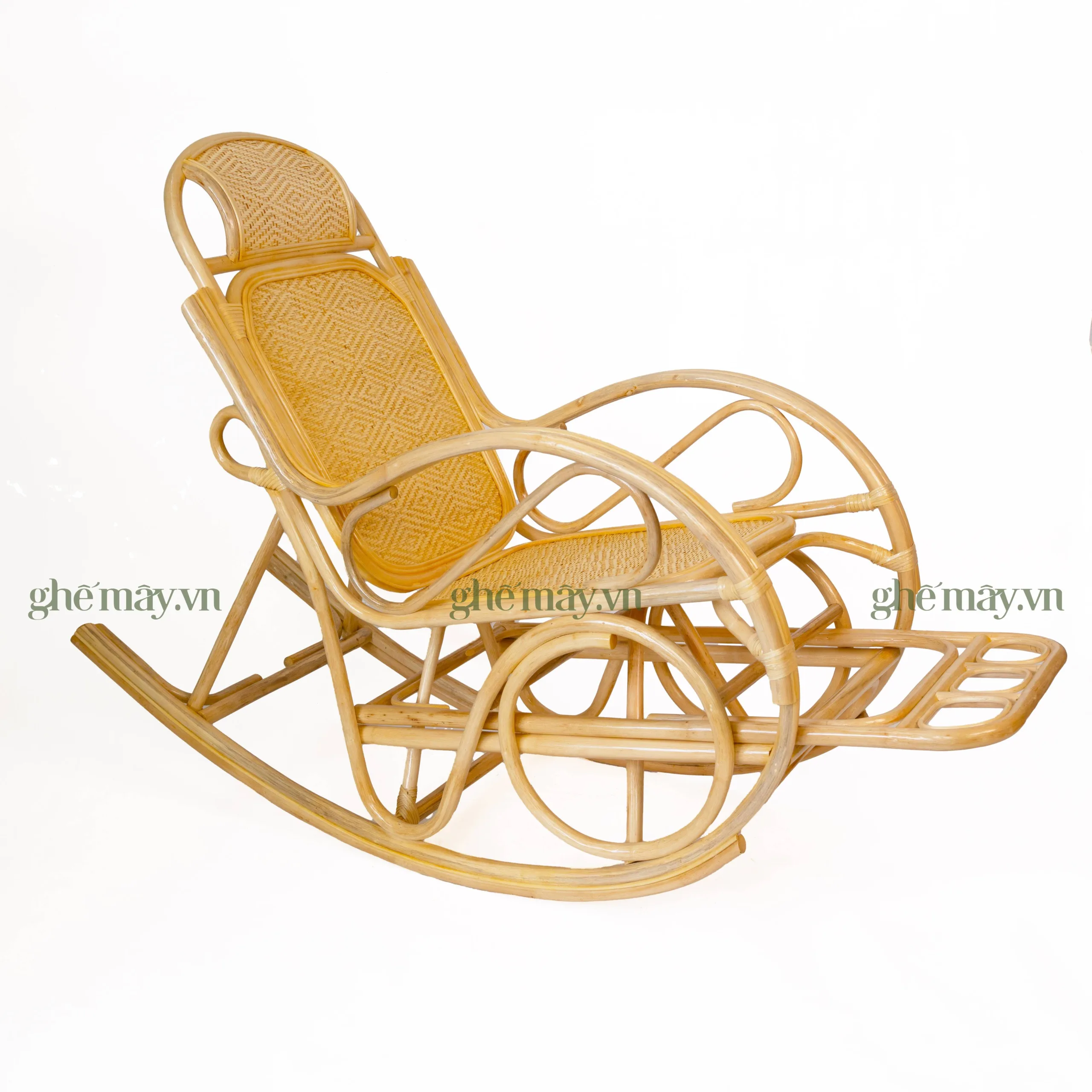Khung ghế được chế tác từ những nhành mây to, dẻo và có độ bền cao. Từ phần khung chính đến tay vịn đều được xử lý và gia công cẩn thận, đảm bảo độ vững chãi và an toàn khi sử dụng. Điểm đặc biệt của ghế bập bênh Phượng Hoàng là phần để chân có thể kéo ra hoặc thu gọn linh hoạt, mang lại sự tiện nghi tối đa. Bên cạnh đó, phần mặt đan ở thân ghế được thiết kế nhô nhẹ như một chiếc gối, giúp người ngồi cảm nhận được sự thư giãn và thoải mái trọn vẹn.