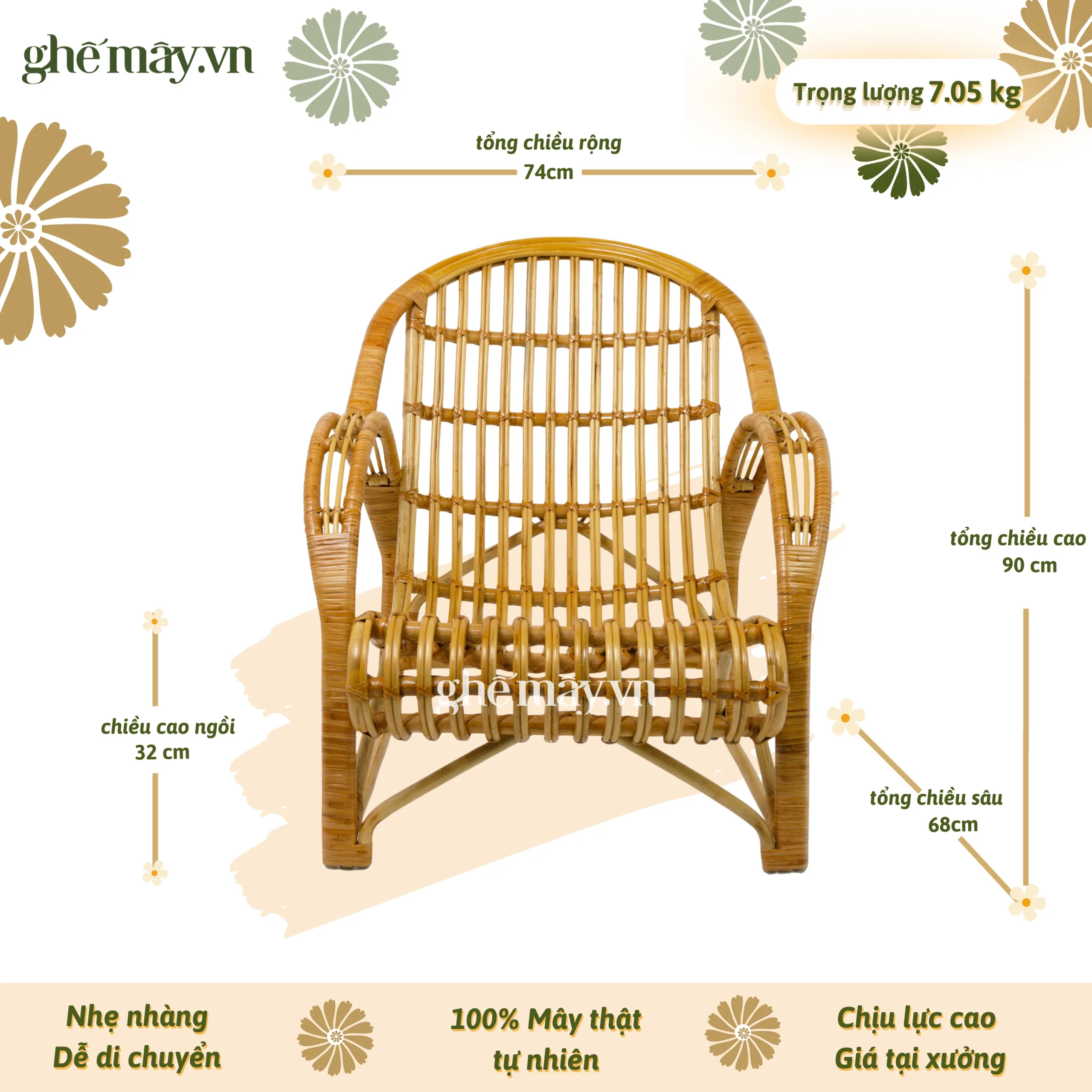 Chiếc ghế không chỉ là món đồ nội thất thông thường mà còn mang trong mình “hồn dân tộc” – một biểu tượng của sự giản dị, bền bỉ và dẻo dai, như chính những sợi mây được đan kết nên hình hài sản phẩm. Mỗi đường cong, mỗi mối nối đều toát lên vẻ đẹp tự nhiên, thân thiện và gần gũi, gợi nhắc đến nếp sống thanh đạm, tinh tế của người Việt xưa.